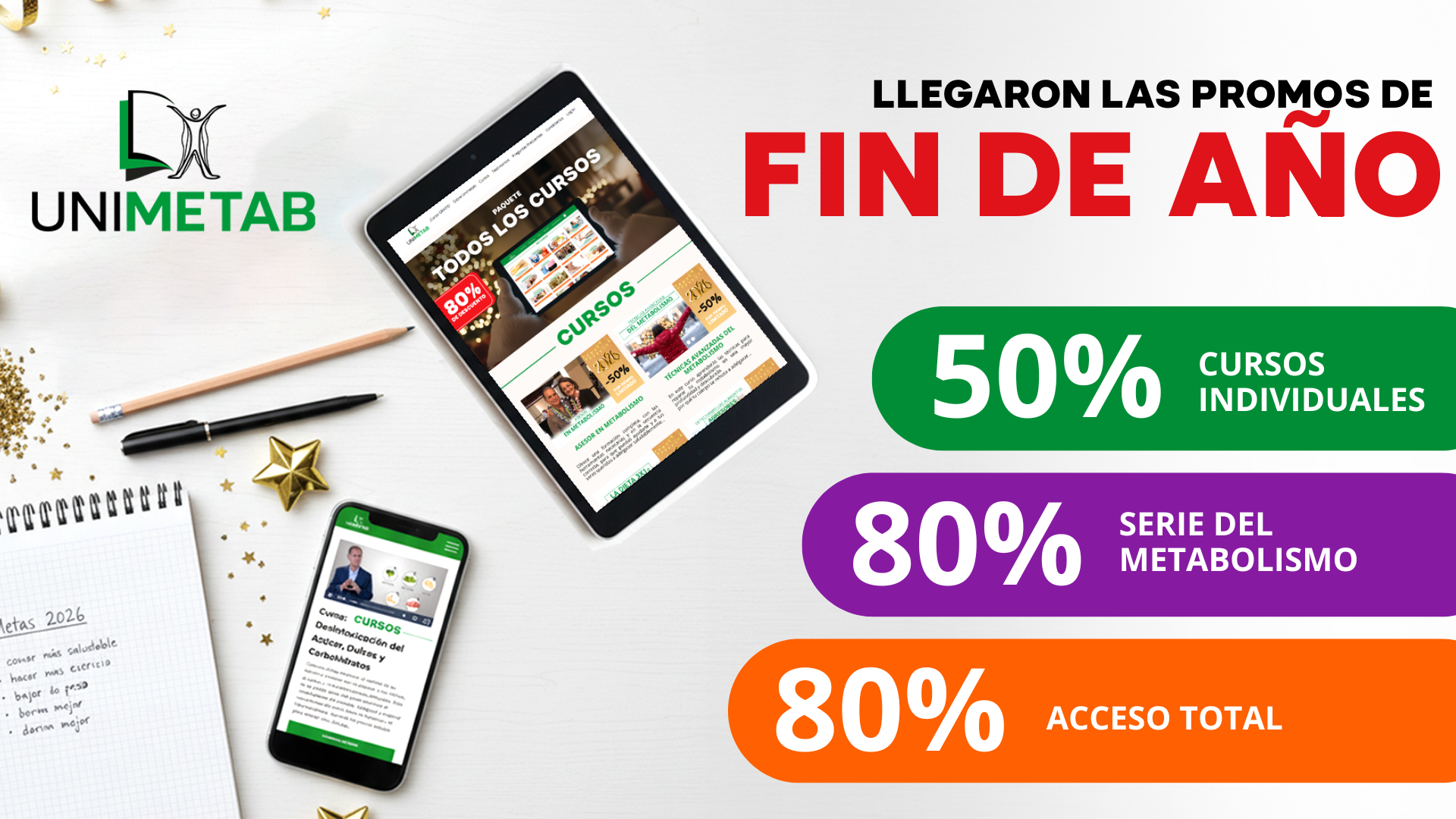 En UNIMETAB creemos que las resoluciones de Año Nuevo deben convertirse en resultados reales. Por eso, por tiempo limitado, hemos activado descuentos especiales para que puedas iniciar esta nueva etapa con el conocimiento adecuado para mejorar tu salud y tu bienestar. Actualmente, el paquete completo con acceso a todos los cursos y La Serie del Metabolismo se encuentran disponibles con 80% de descuento, mientras que los cursos individuales, los cursos avanzados y los cursos de asesoría cuentan con un 50% de descuento.