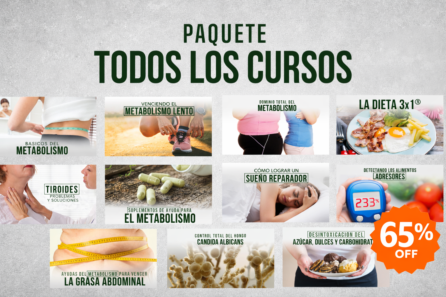 Esta oferta incluye TODOS los CURSOS publicados en UNIMETAB hasta el momento: Básicos del Metabolismo, Venciendo el Metabolismo Lento, Dominio Total del Metabolismo, Tiroides: Problemas y Soluciones, Control Total del Hongo Candida Albicans, Cómo Lograr un Sueño Reparador, Ayudas del Metabolismo para Vencer la Grasa Abdominal, Detectando los Alimentos Agresores, Desintoxicación del Azúcar, Dulces y Carbohidratos, Suplementos de Ayuda para el Metabolismo, La Dieta 3x1, los cursos de "Asesor en Metabolismo", "Asesor Avanzado en Metabolismo" y "Técnicas Avanzadas del Metabolismo"